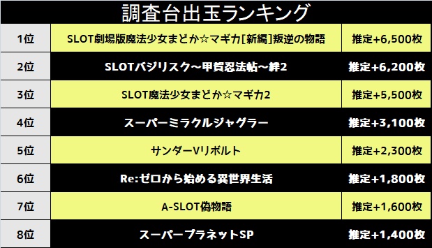 今回はバラエティーコーナーから【リゼロ】が+6,100枚でトップを獲得。優秀台のポテンシャルの高さを見せてくれました。今回全台調査台が2箇所となり【モンハンワールド】が+3,500枚、+2,200枚と好調でした。並びでの【バーサス】+2,400枚、【クラセレ】+2,000枚と各調査箇所に見せ場のある調査となりました。