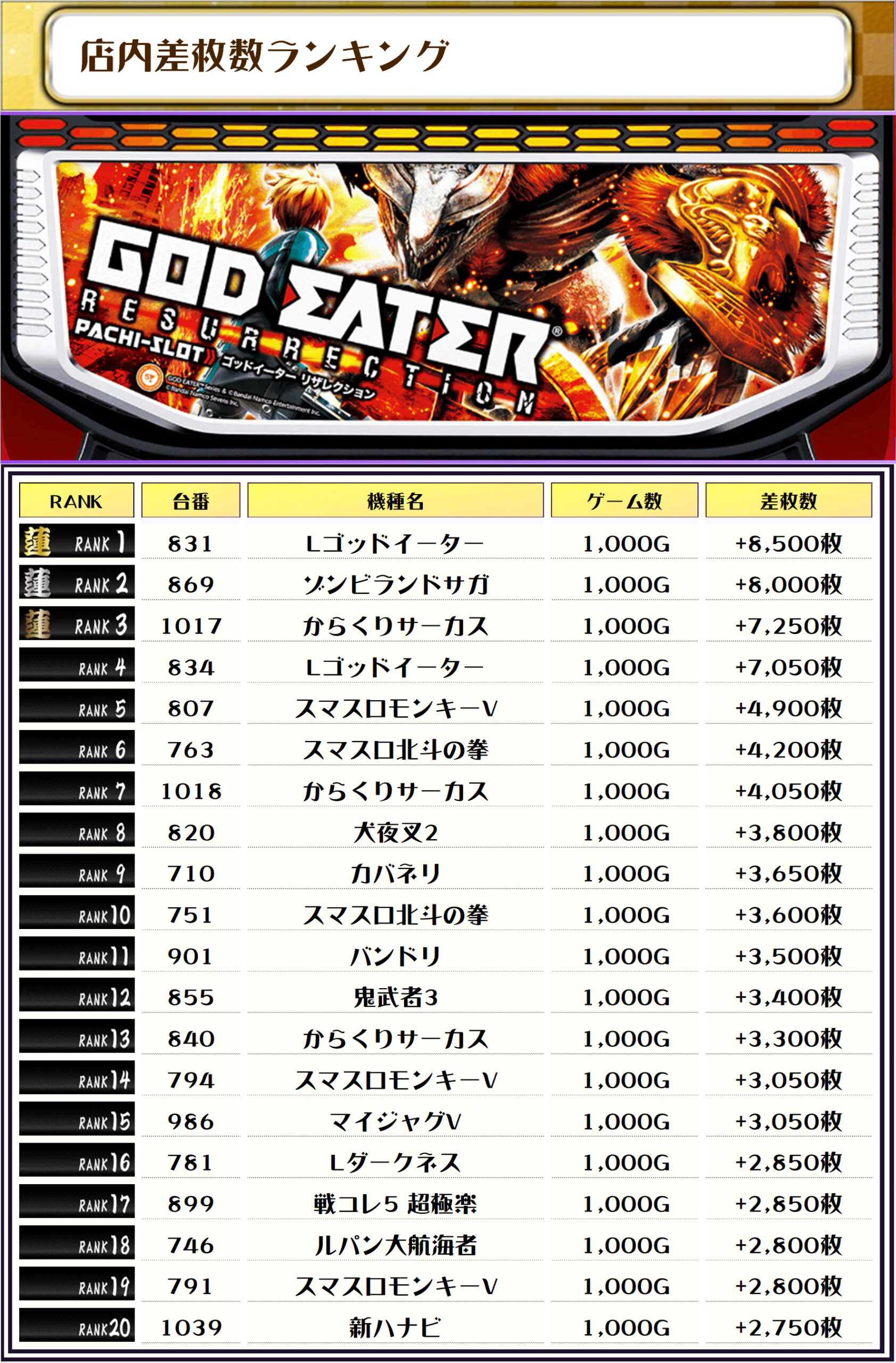 この日の全体差枚トップは【Lゴッドイーター・831番台】の+8,500枚❗️
