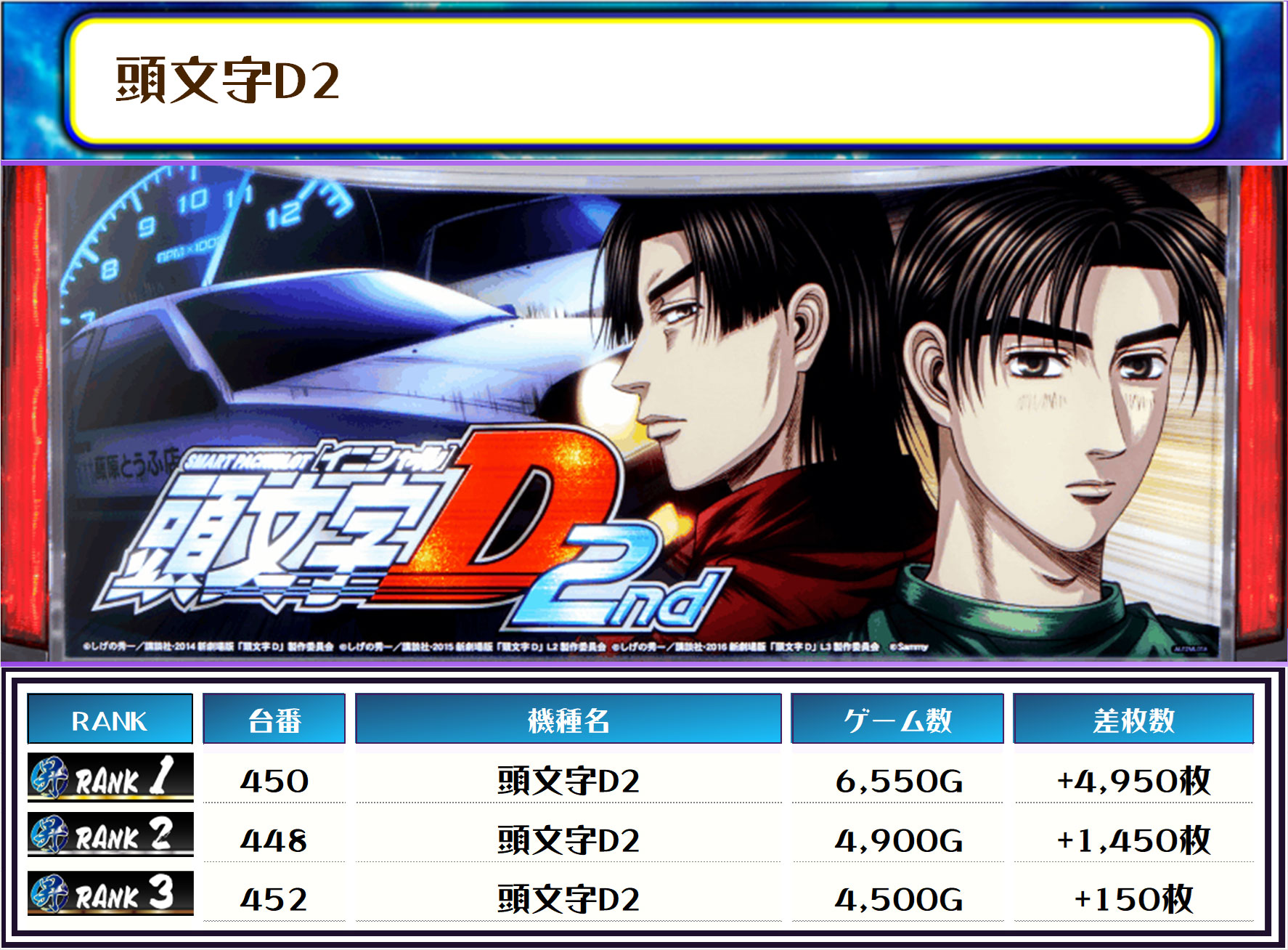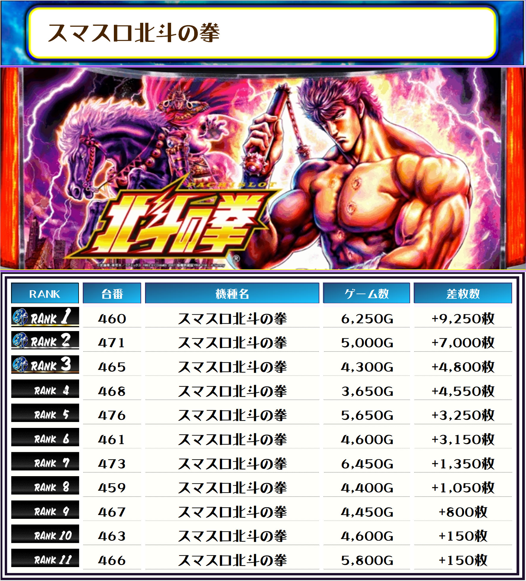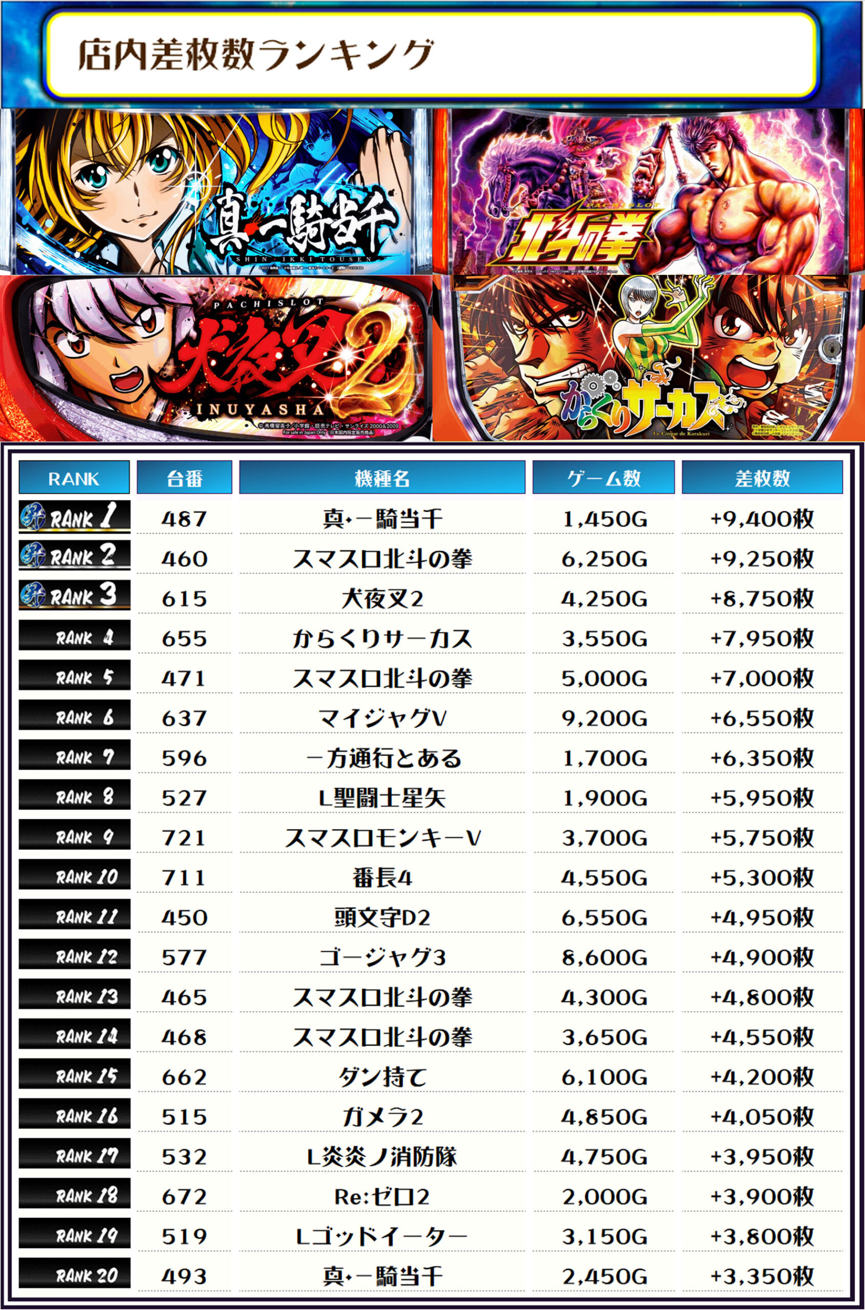 2位には【スマスロ北斗の拳・460番台】の+9,250枚、3位には【犬夜叉2・615番台】の+8,750枚がランクインしましたー