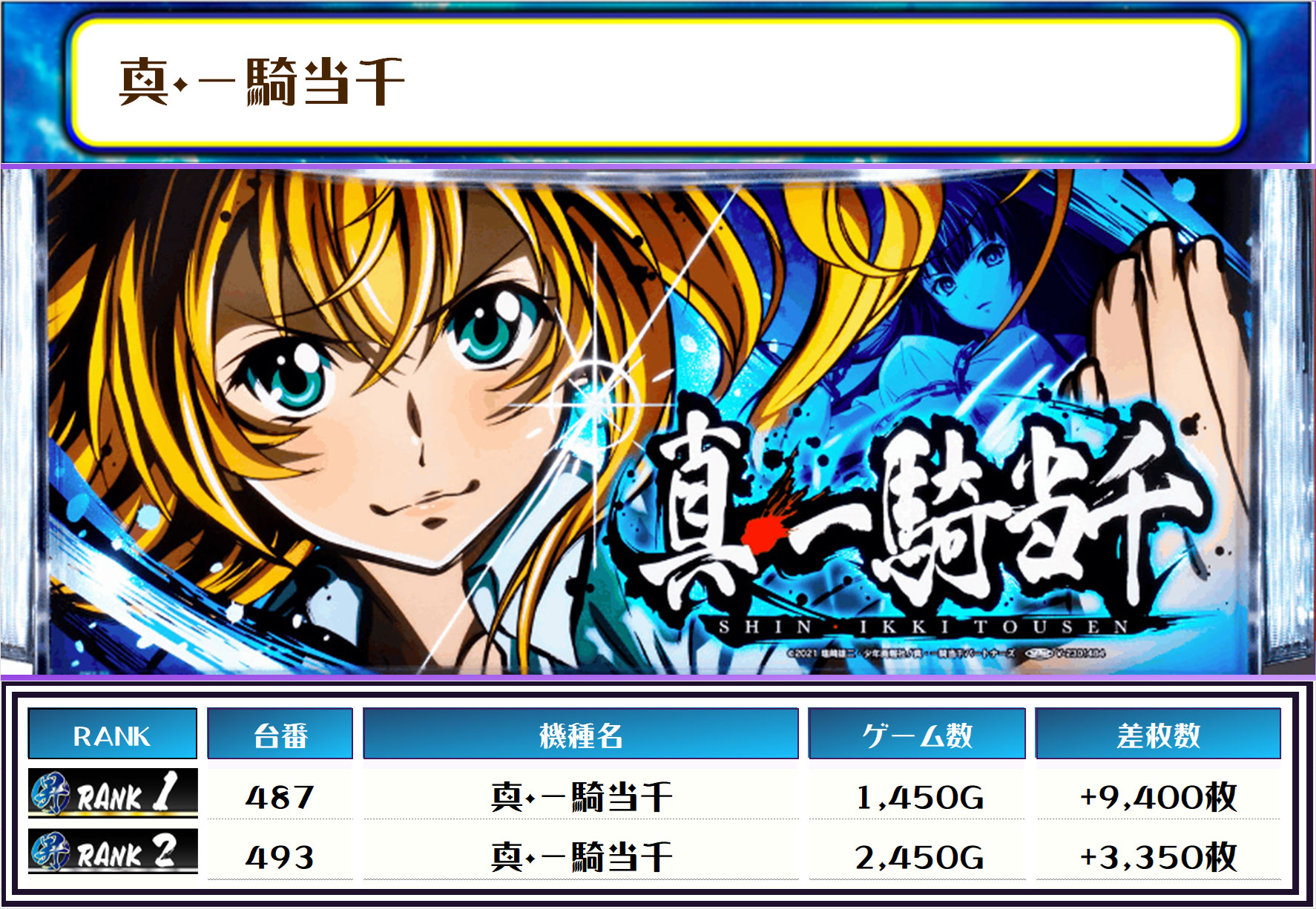 この日の全体差枚トップは【真・一騎当千・487番台】+9,400枚っ💥💥💥