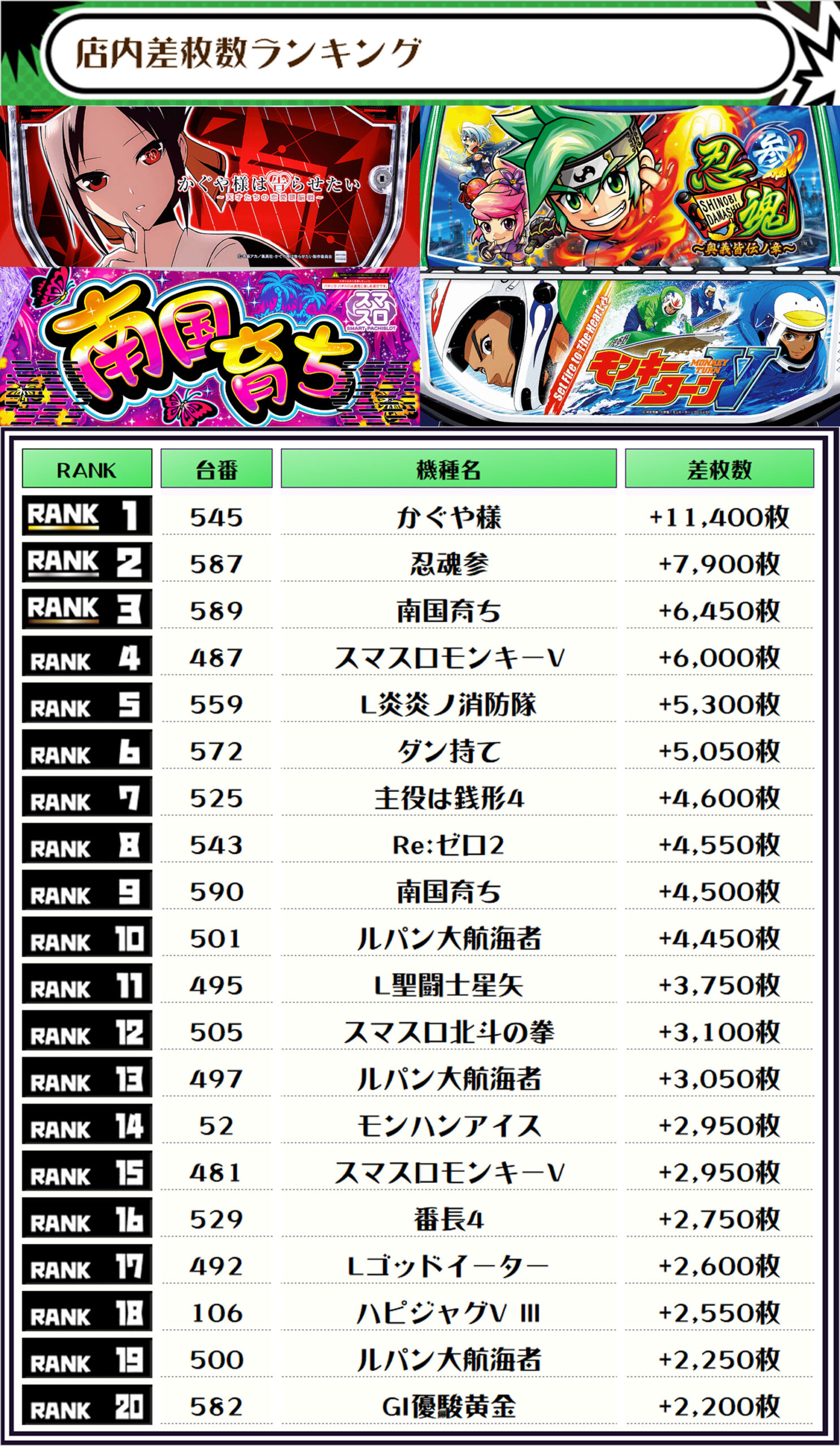 この日、全体差枚のTOPを飾ったのは【かぐや様・545番台】で差枚は+11,400枚!