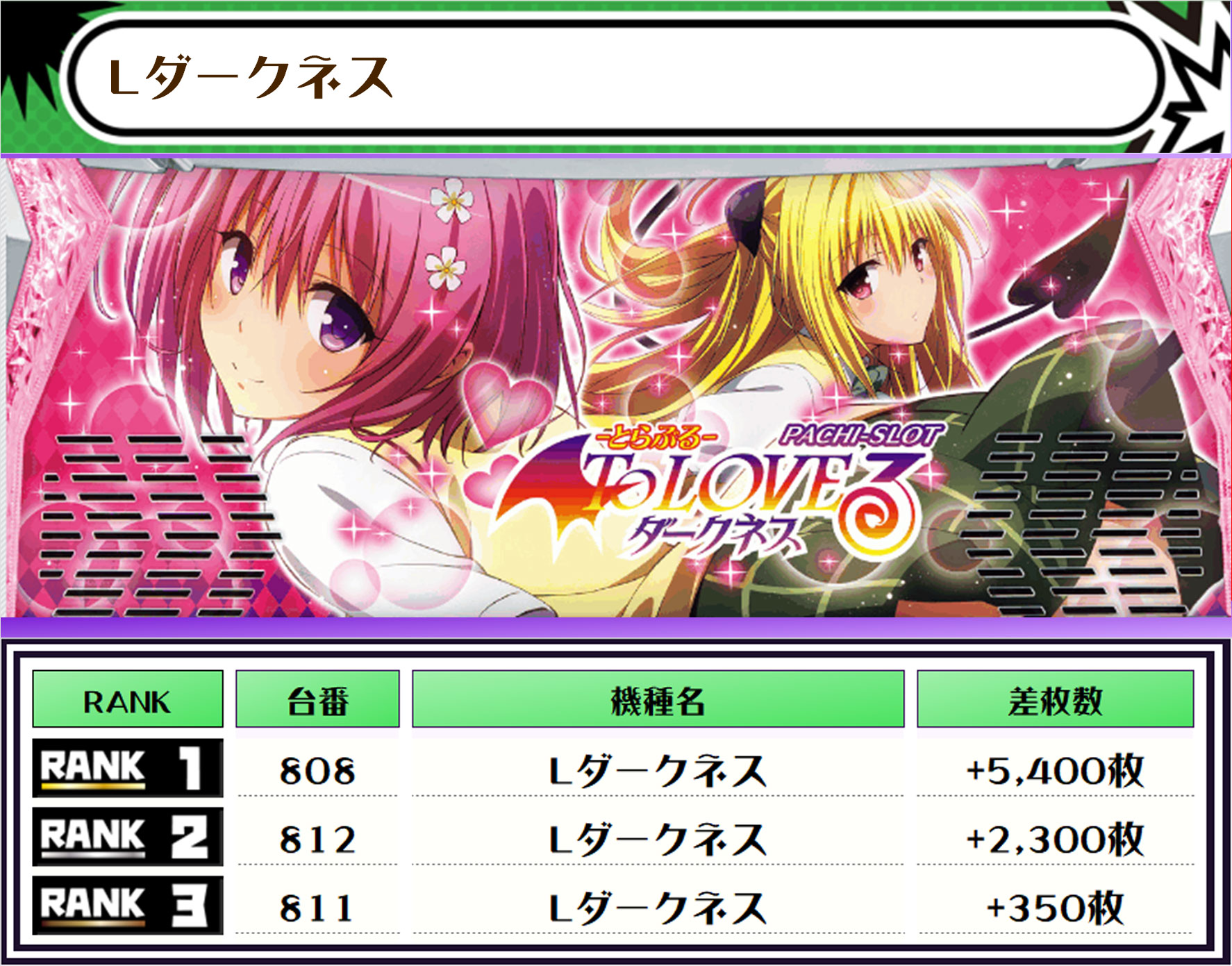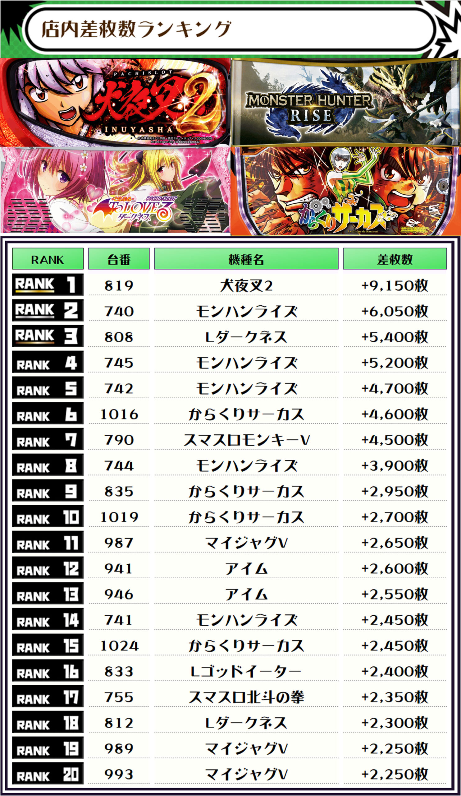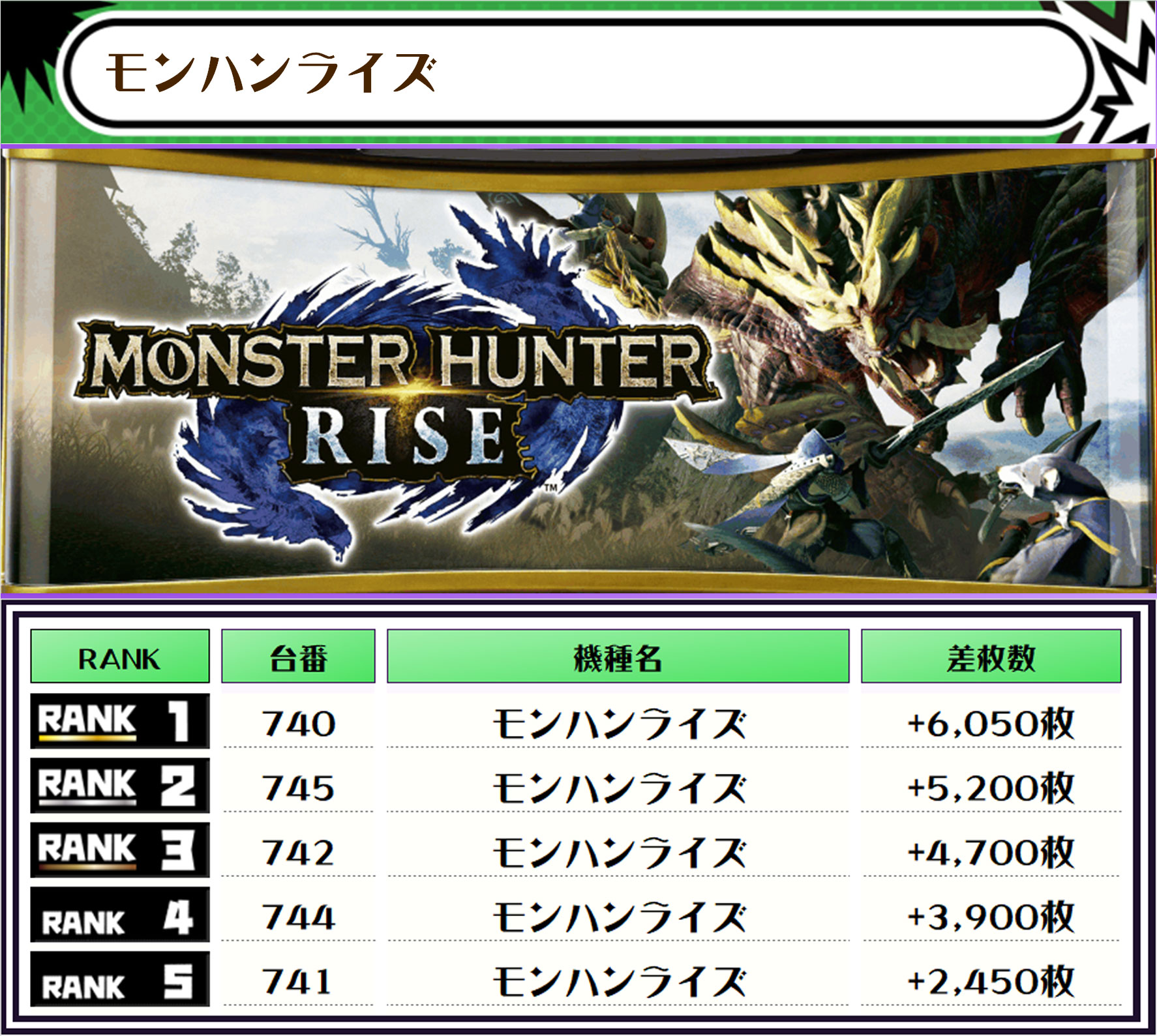 続く2位には【モンハンライズ・740番台】の+6,050枚、3位には【Lダークネス・808番台】の+5,400枚が入賞しましたーっ