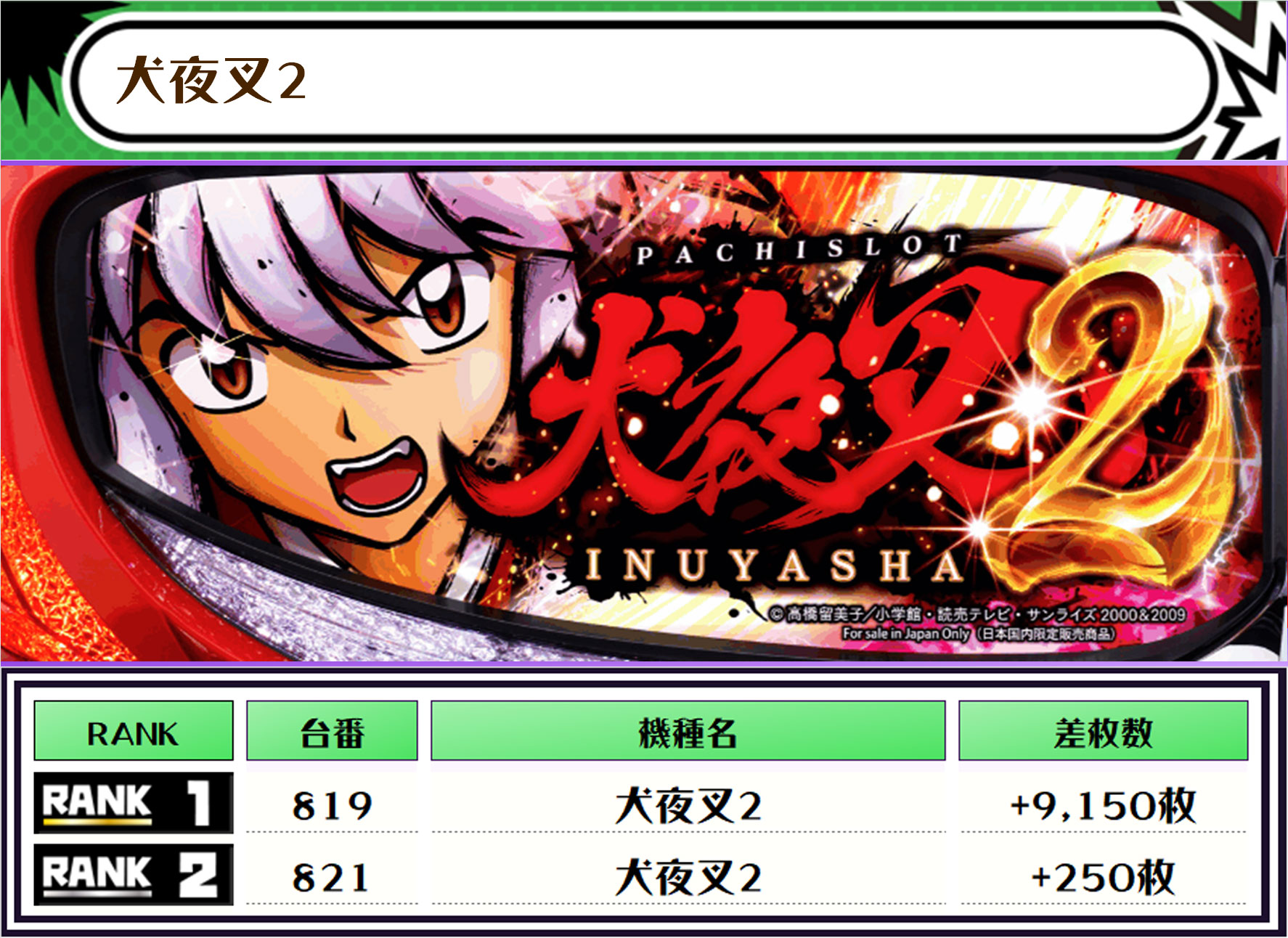 全体差枚トップに輝いたのは【犬夜叉2・819番台】の+9,150枚っ💫