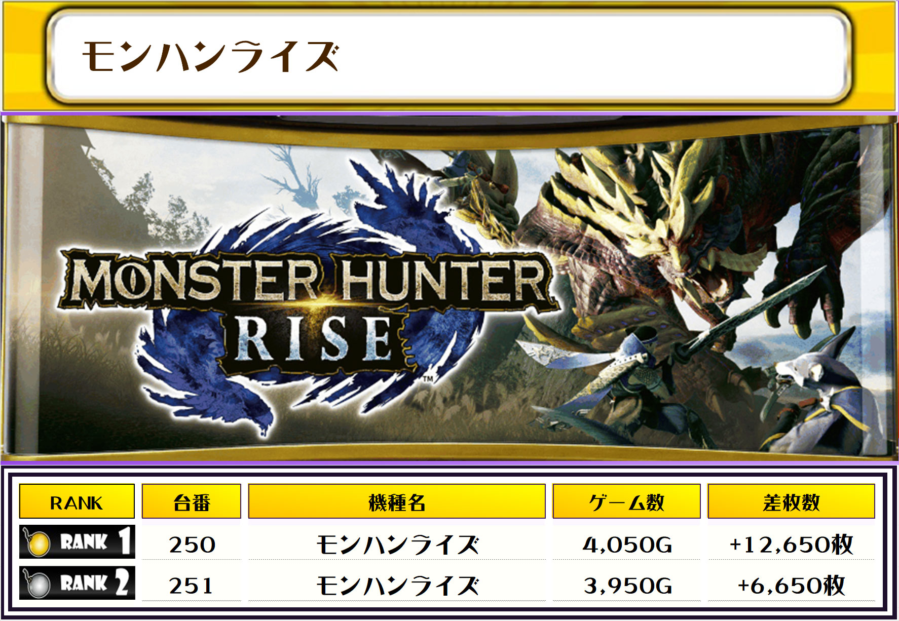 全体のTOP差枚は【モンハンライズ・250番台】で差枚は+12,650枚💥💥💥