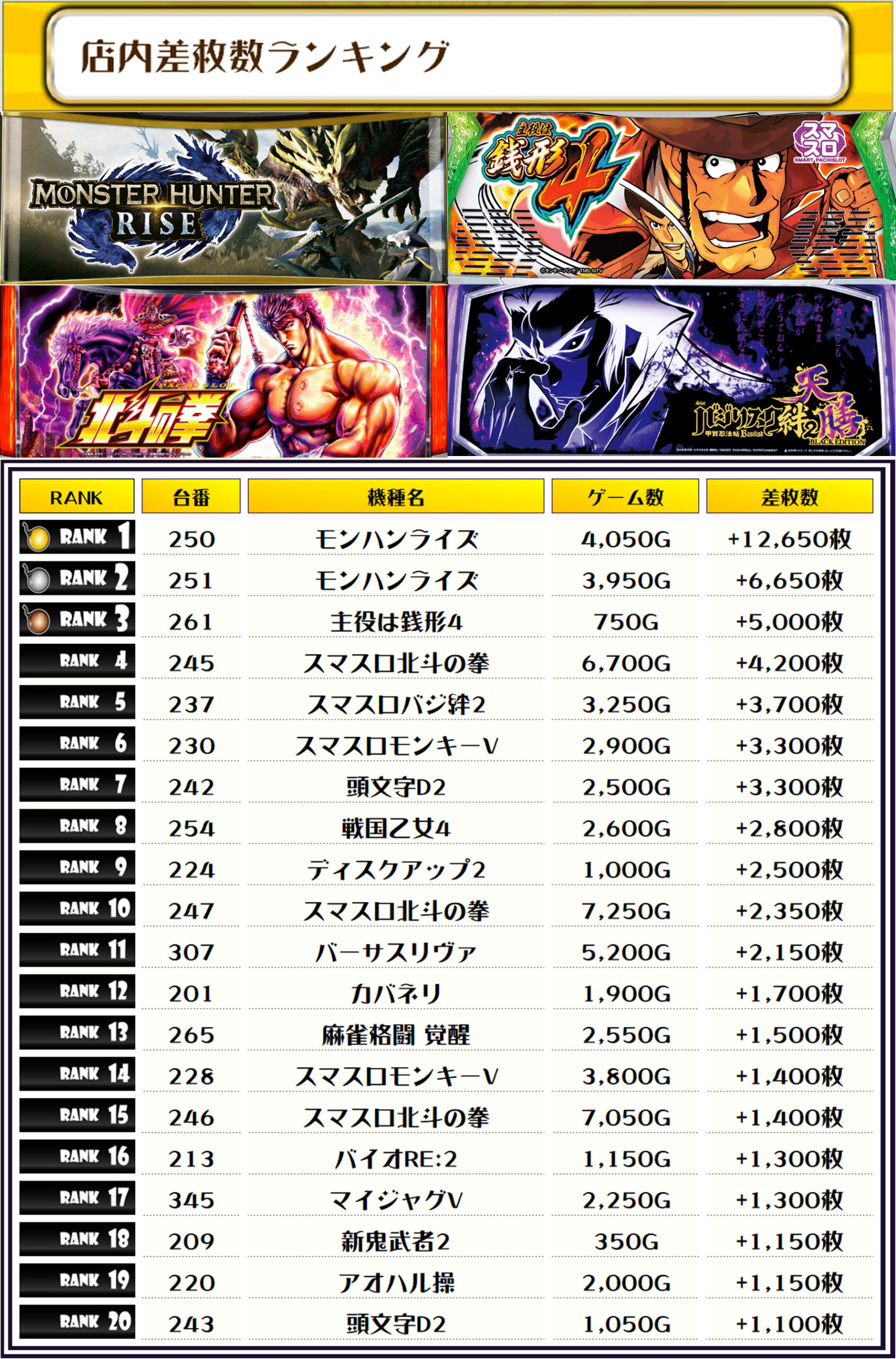 続く2位には同じく【モンハンライズ・251番台】の+6,650枚、3位に【主役は銭形4・261番台】の+5,000枚がランクインしました❗️