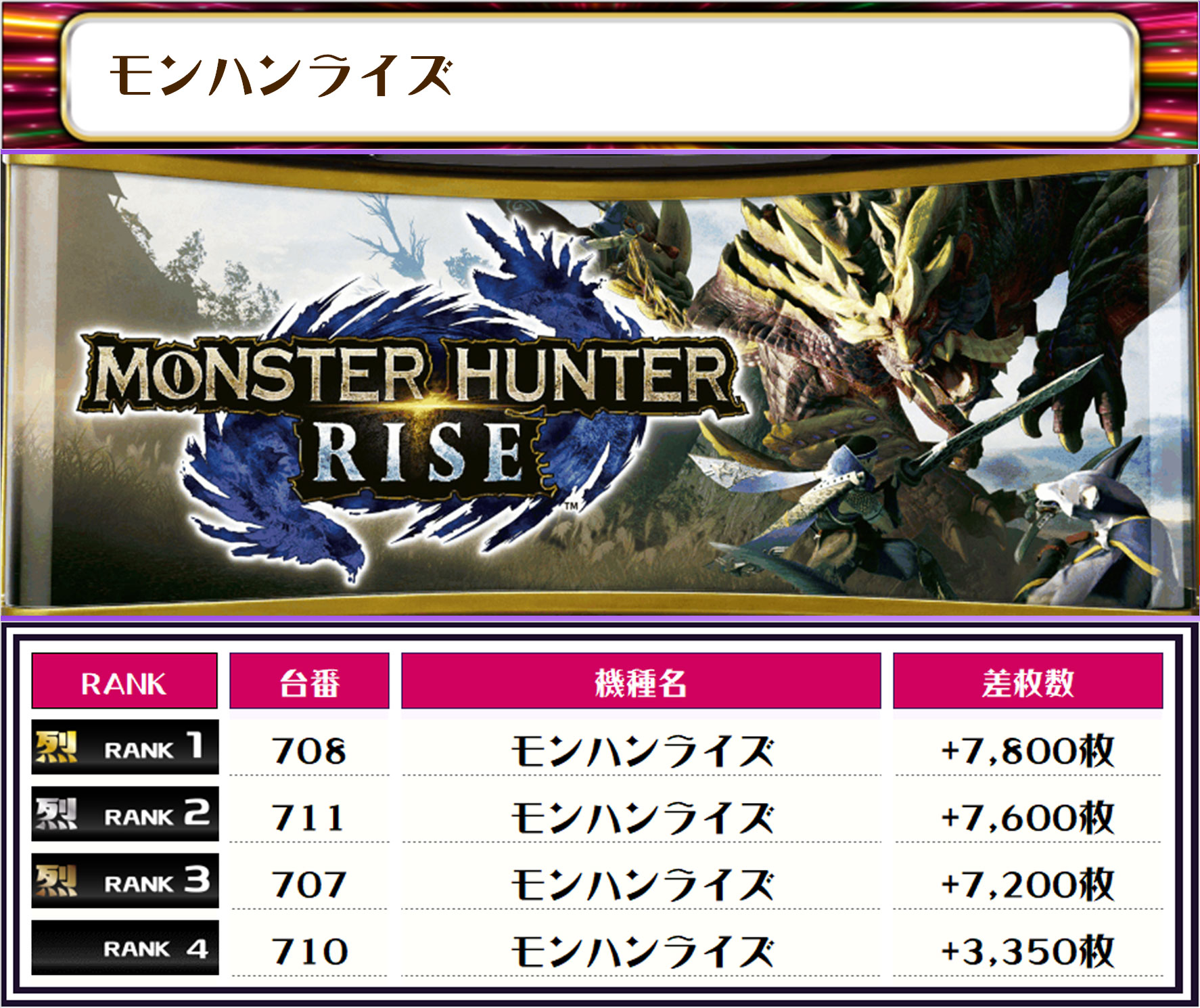 続く2位には【モンハンライズ・711番台】の+7,600枚、3位には【モンハンライズ・707番台】の差枚+7,200枚がランクインしましたーっ🙆‍♀️