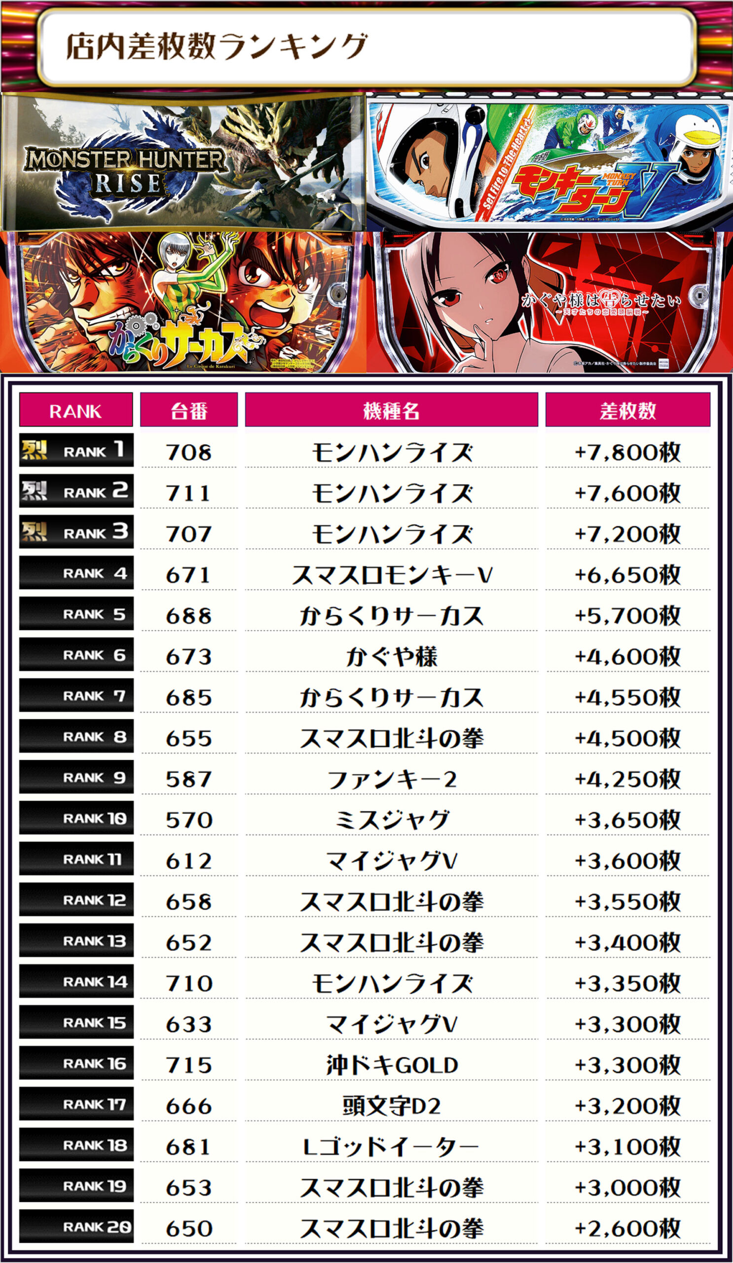 最後に、この日の店内差枚ランキングをご覧ください❣️