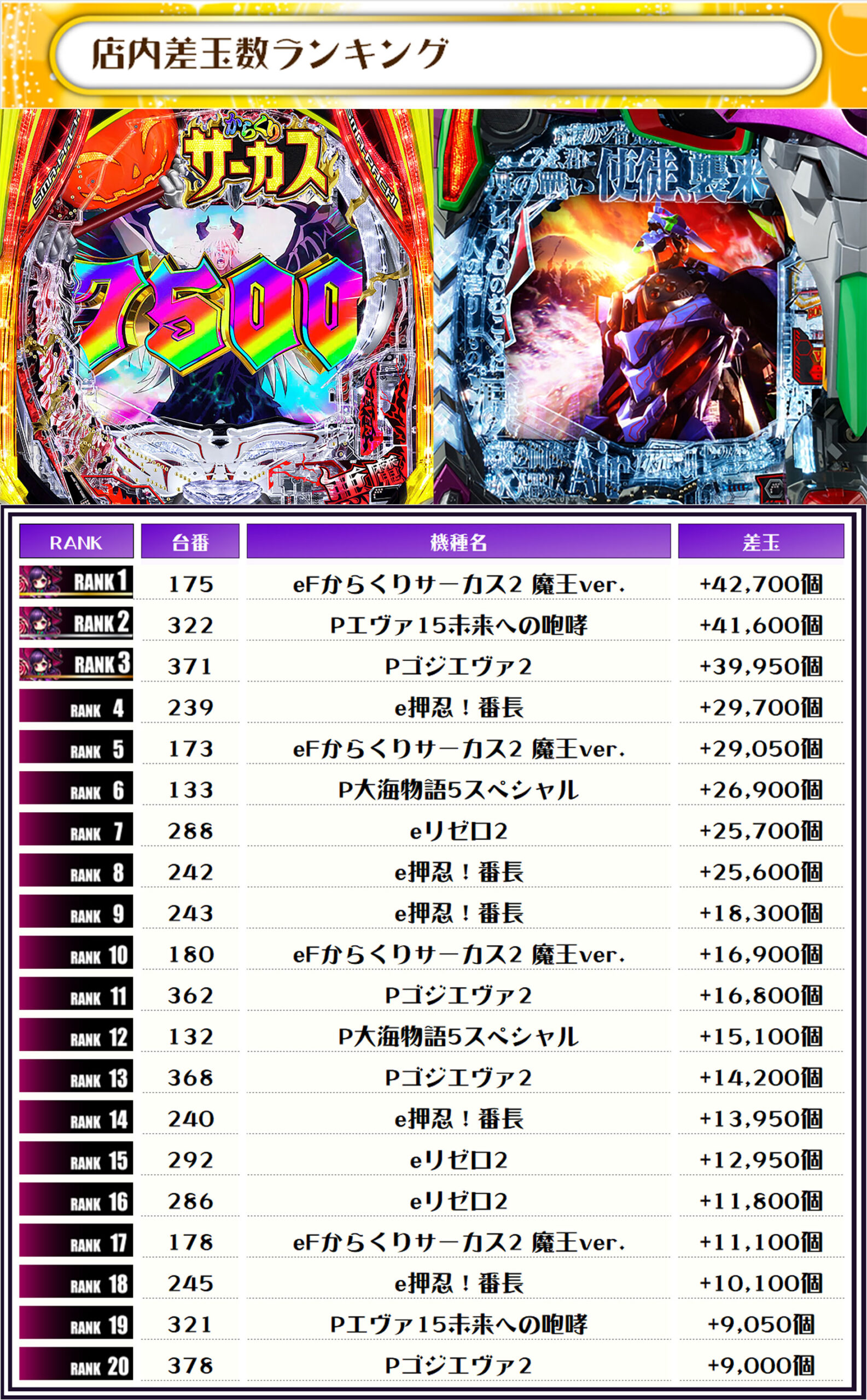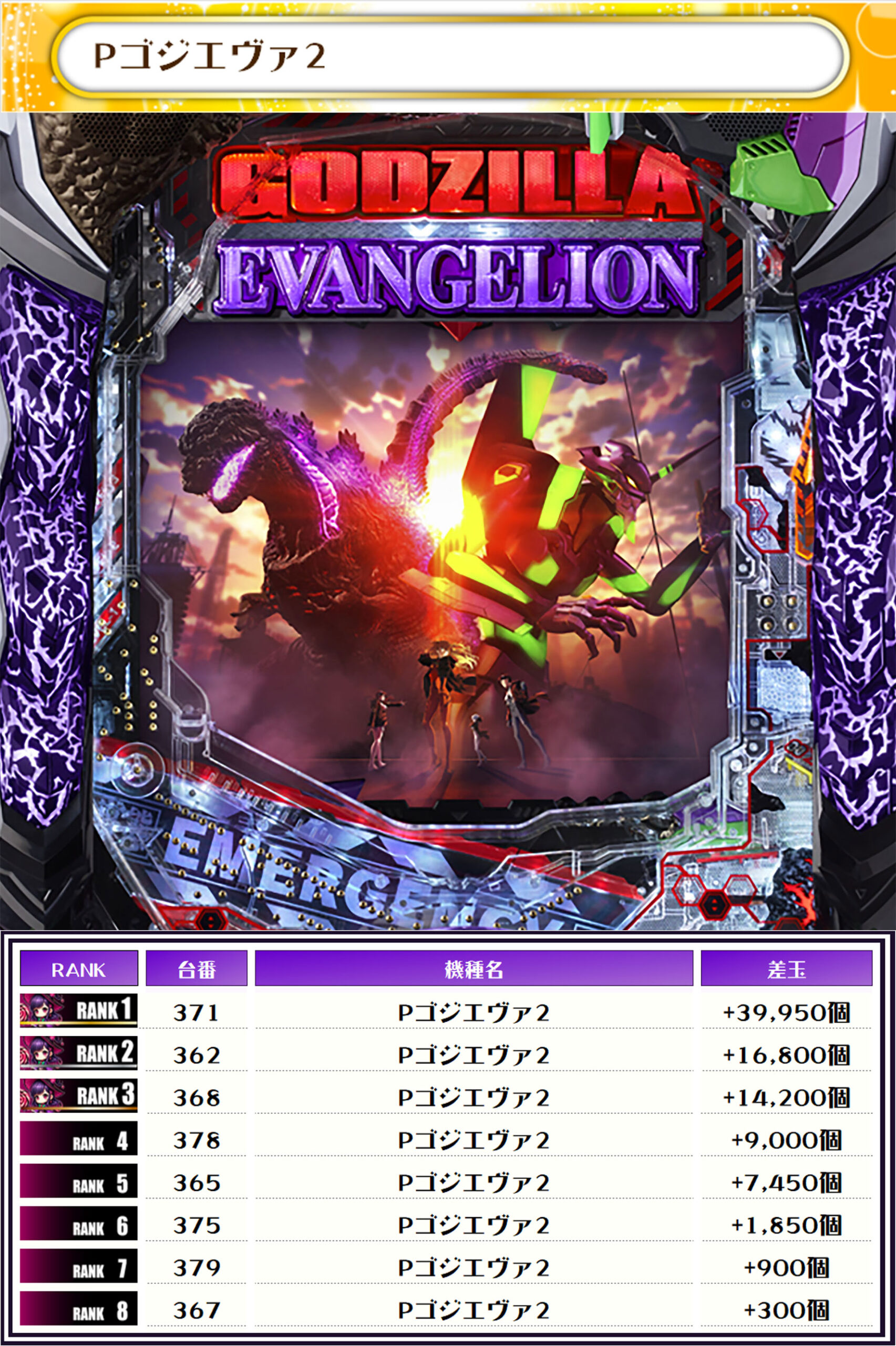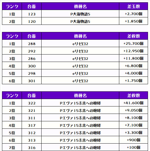 2位には【Pエヴァ15未来への咆哮・322番台】の+41,600発、3位には同じく【Pゴジエヴァ2・371番台】の+39,950発がランクインしました~✨