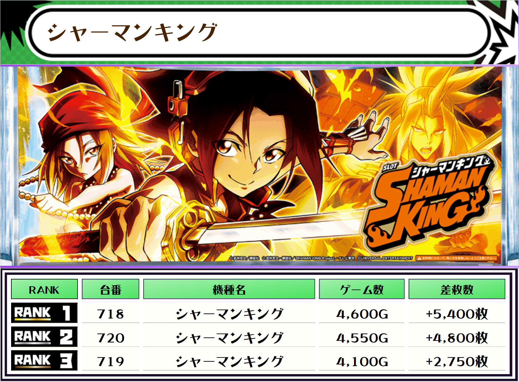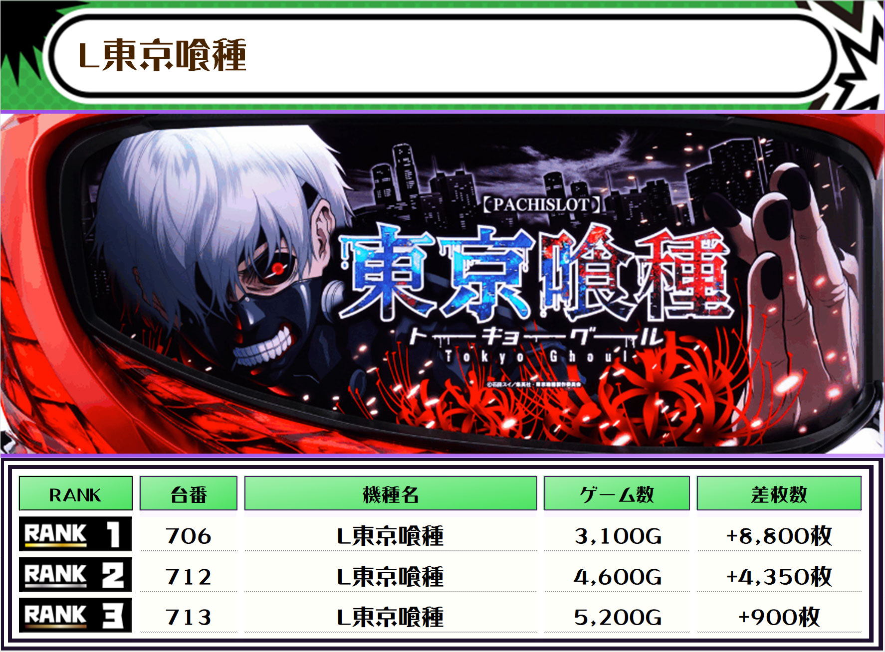今回は新台のL東京喰種・SBJ・シャーマンキングが多くランクインを果たし、もしかしたら良さげな台が並んでいたのかも🤔