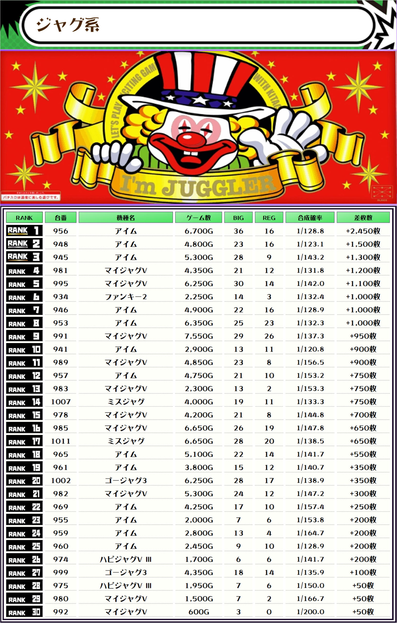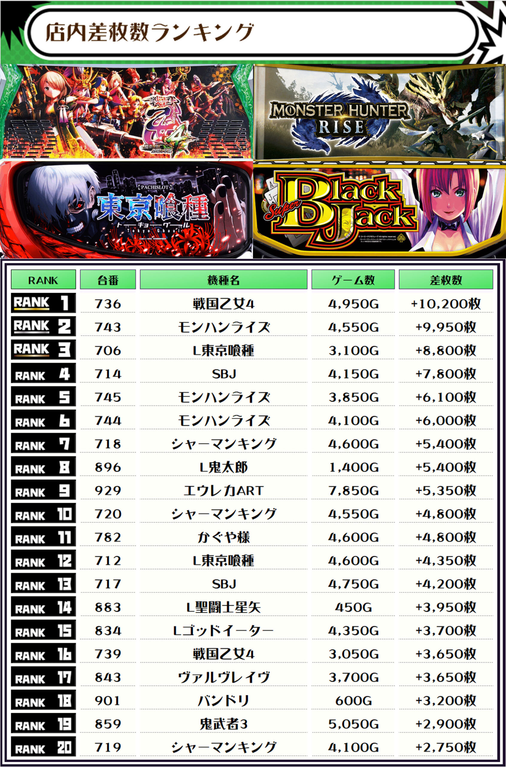 この取材では複数台設置の全機種および全体差枚トップ20をランキング形式でお伝えします❗️