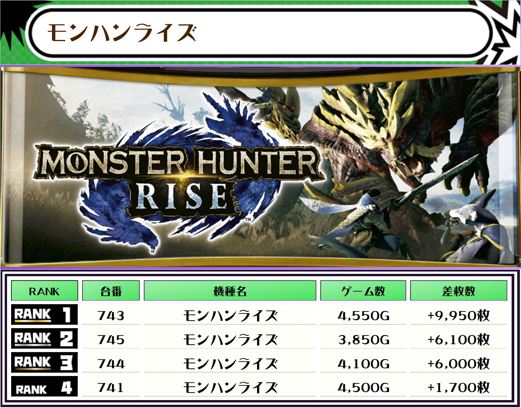 続く2位には【モンハンライズ・743番台】の+9,950枚、3位には【L東京喰種・706番台】の+8,800枚が入賞しましたーっ