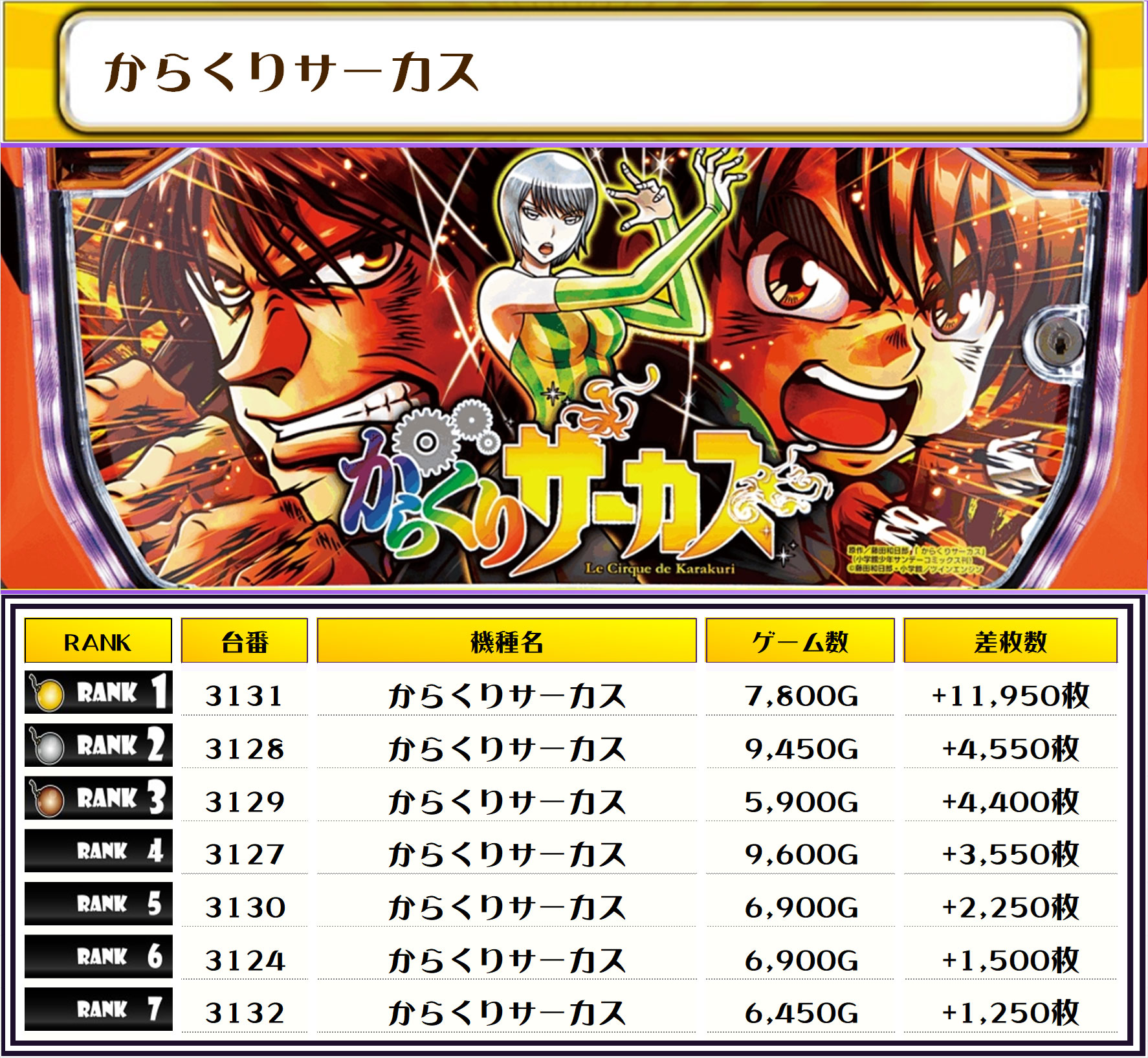 この日全体差枚のトップに輝いたのは【からくりサーカス・3131番台】差枚は+11,950枚を記録っ❣️