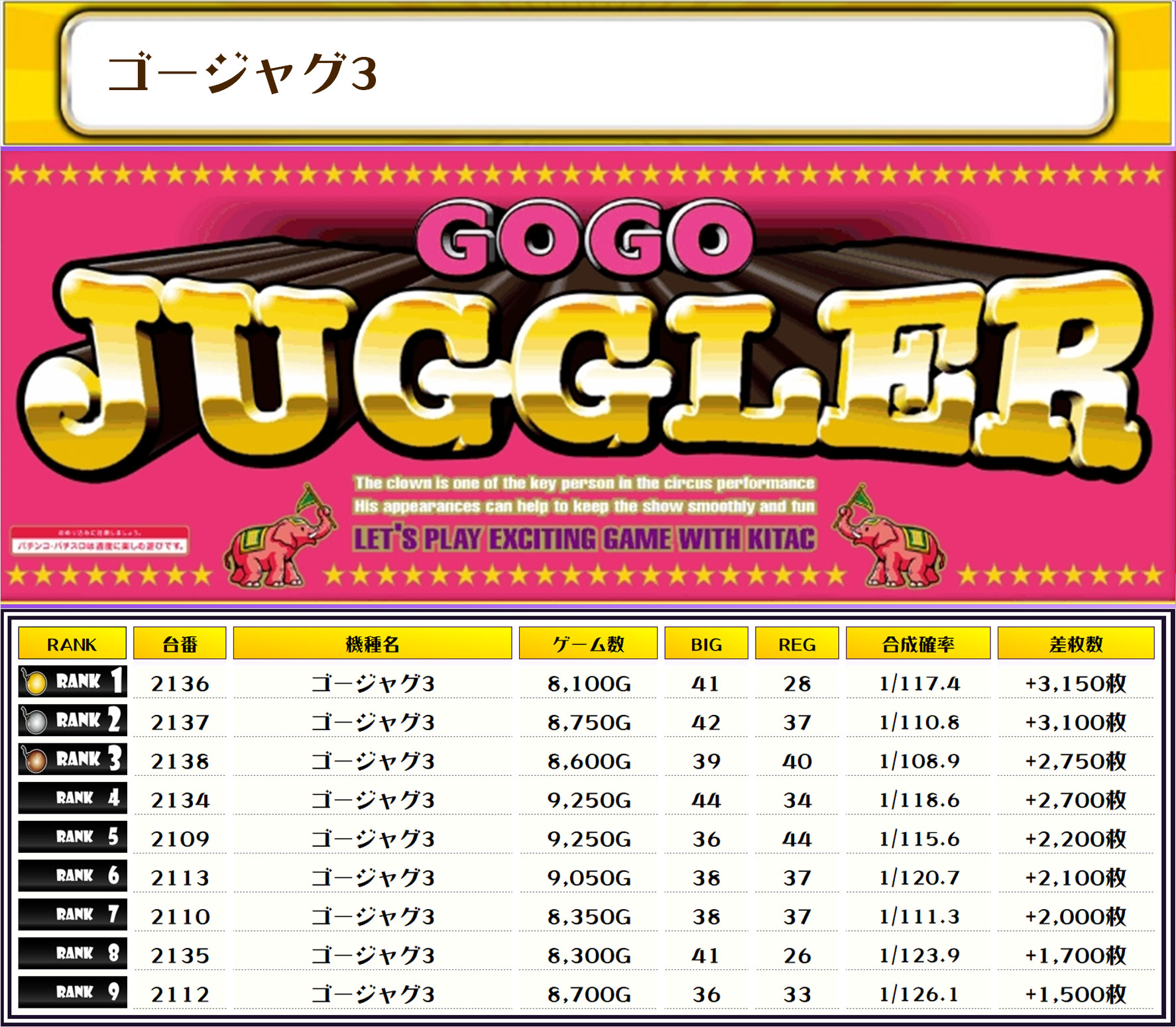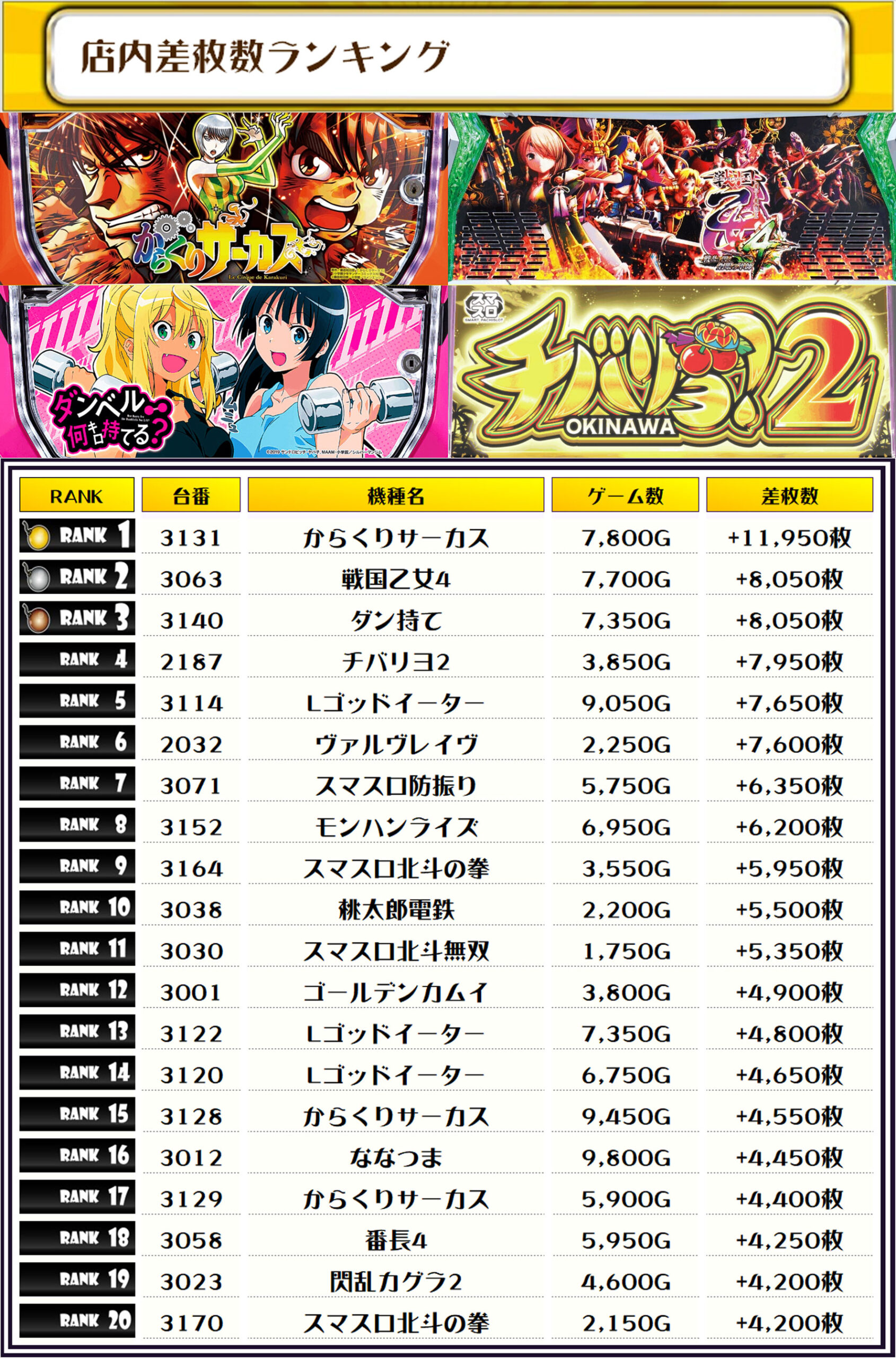 ちなみに、この取材では複数台設置の全機種および全体差枚トップ20ランキング形式でお伝えしていくぞ‼️