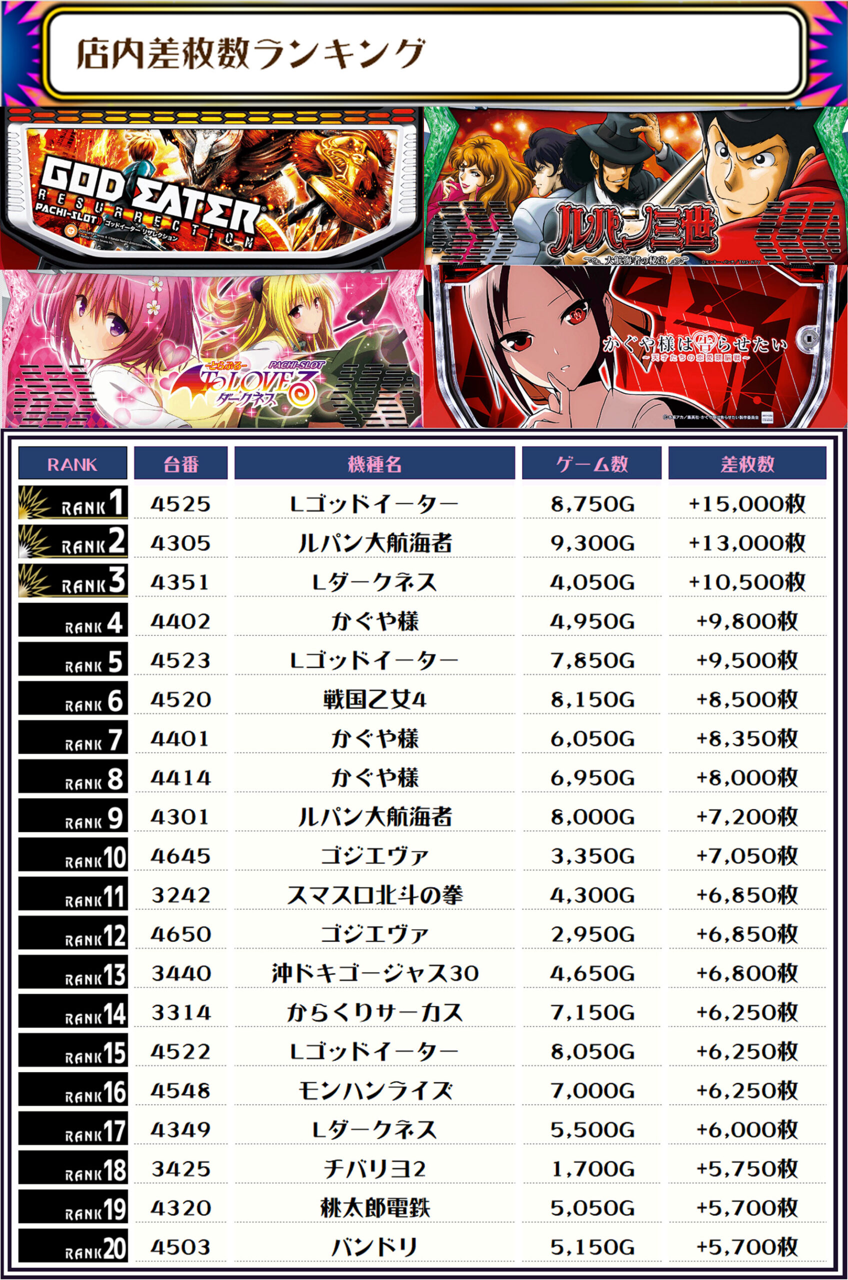 2位は【ルパン大航海者・4305番台】の+13,000枚、3位は【Lダークネス・4351番台】の+10,500枚がランクインしましたっ🔥