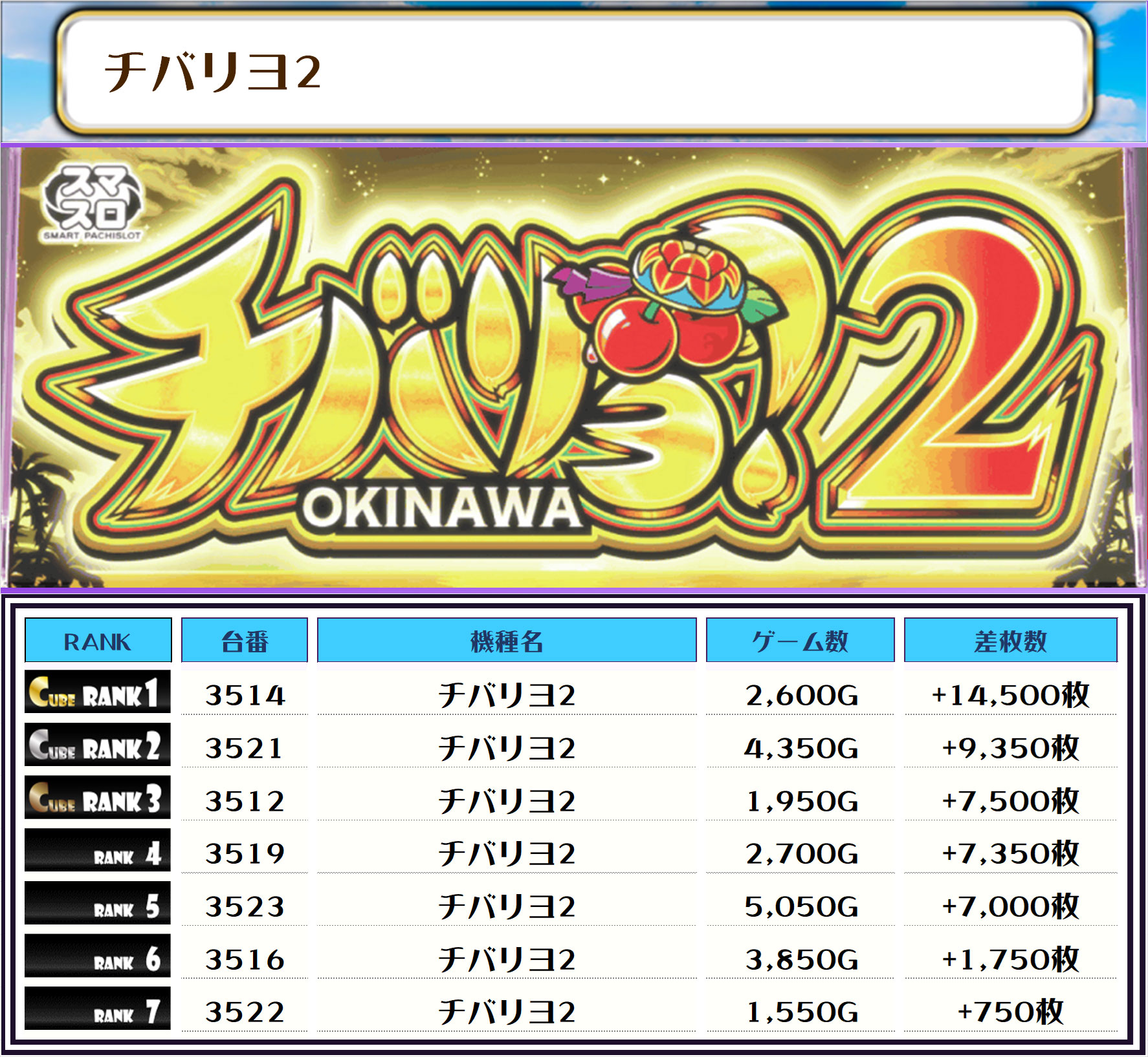 この日、全体のトップ差枚に輝いたのは【チバリヨ2・3514番台】で差枚は+14,500枚❗️