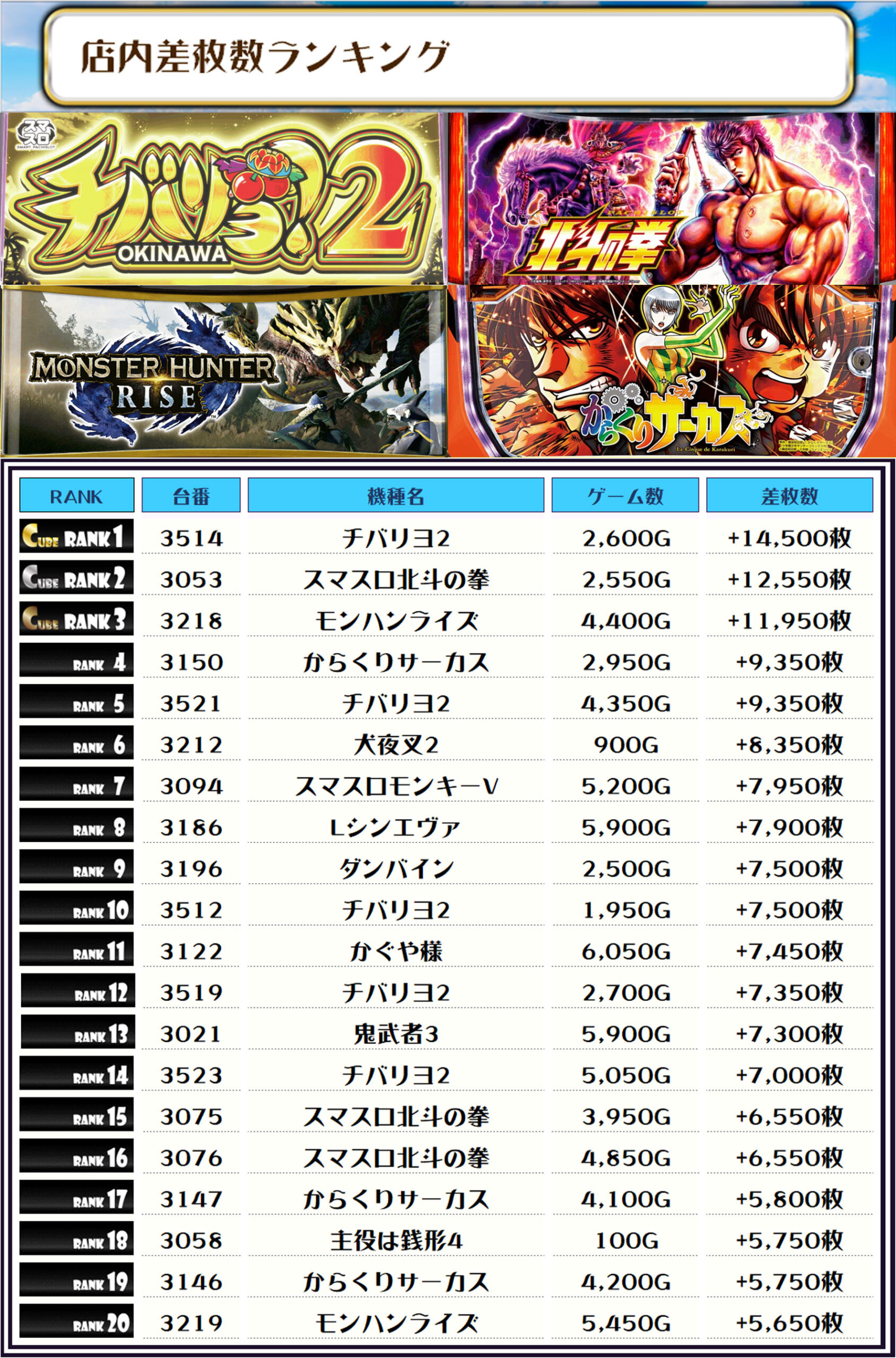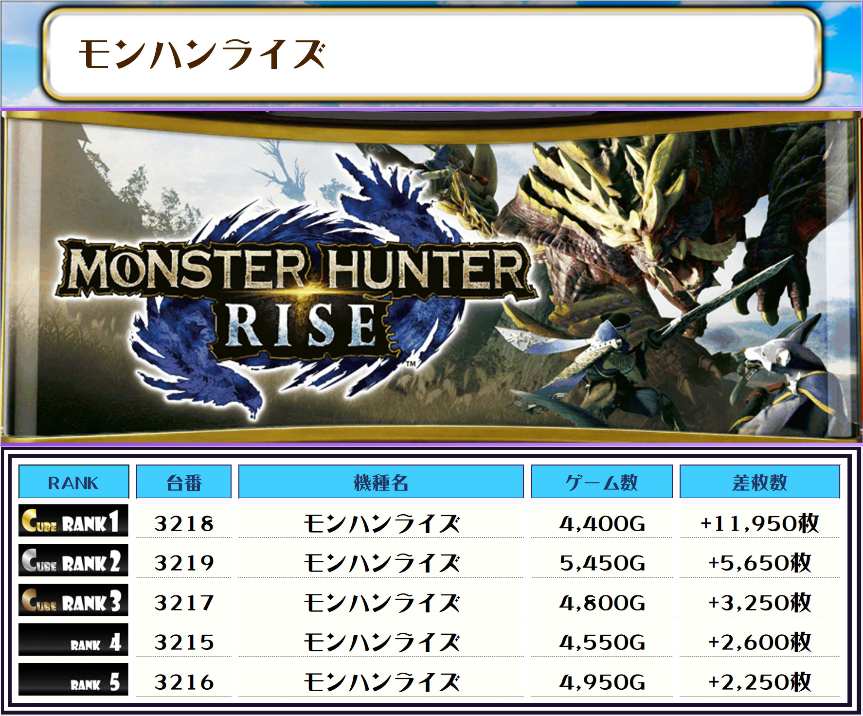 2位には【スマスロ北斗の拳・3053番台の+12,550枚、3位には【モンハンライズ・3218番台】の+11,950枚がランクインしたでやんすっ❗️