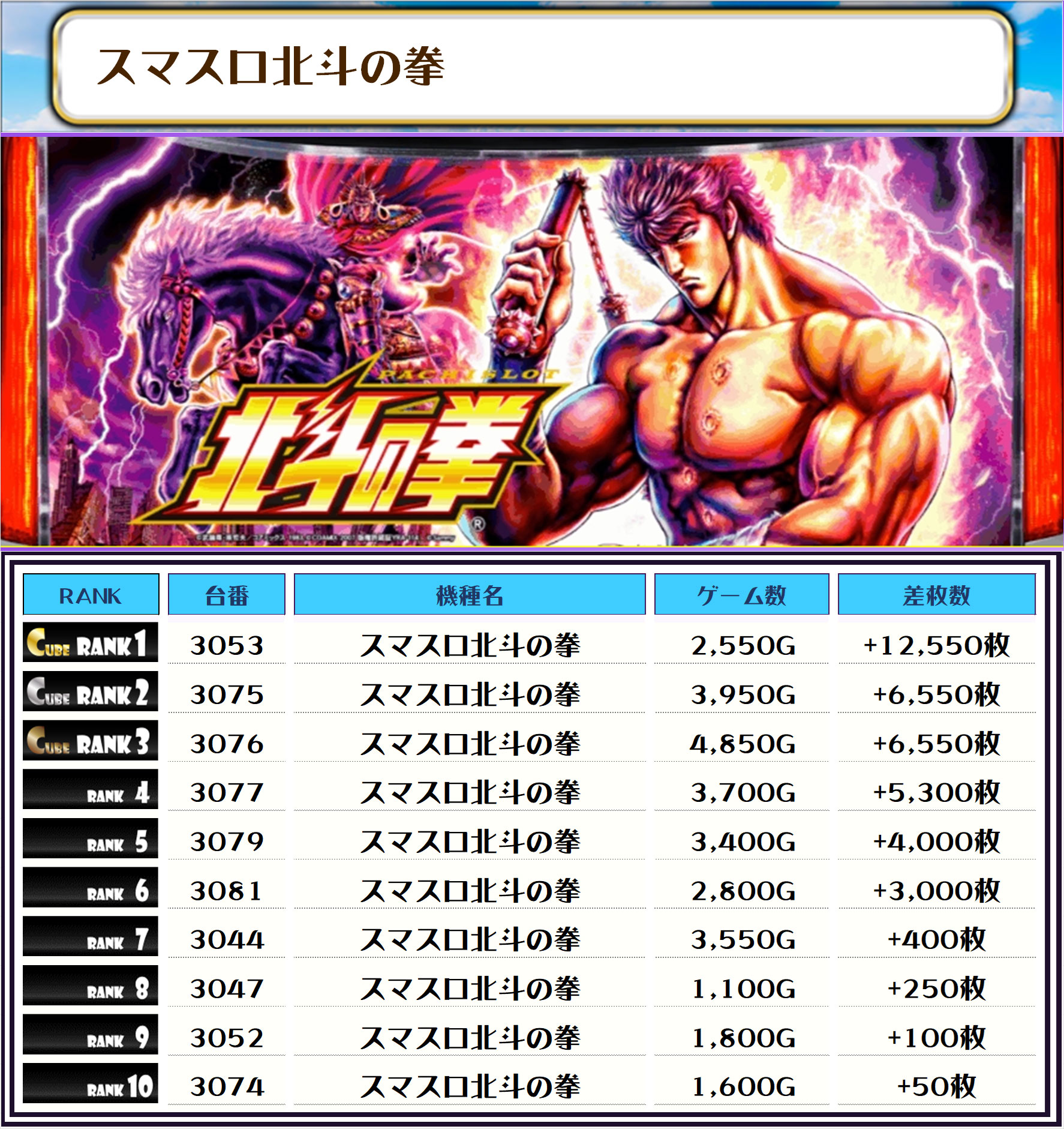 今回は万枚超×3、そしてメイン機種のスマスロ北斗の拳が複数ランクインしたでやんすっ📷