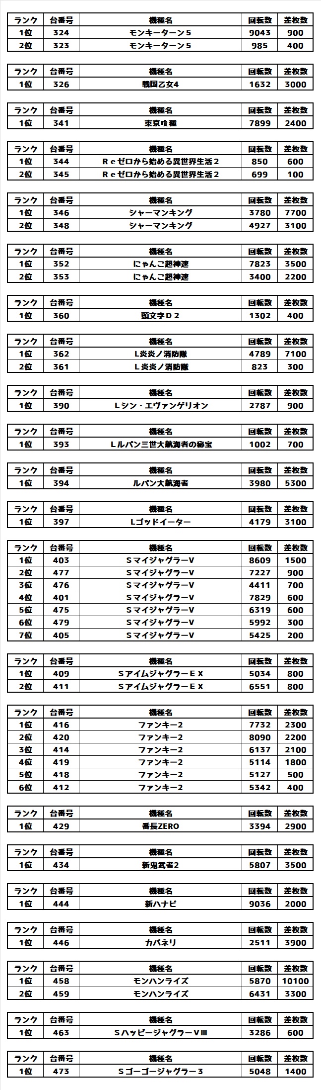 ※この取材では複数台設置の全機種および全体差枚トップ30をランキング形式でお伝えしています。