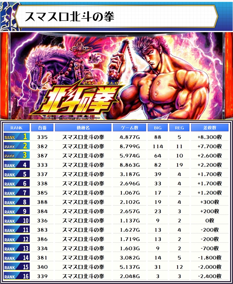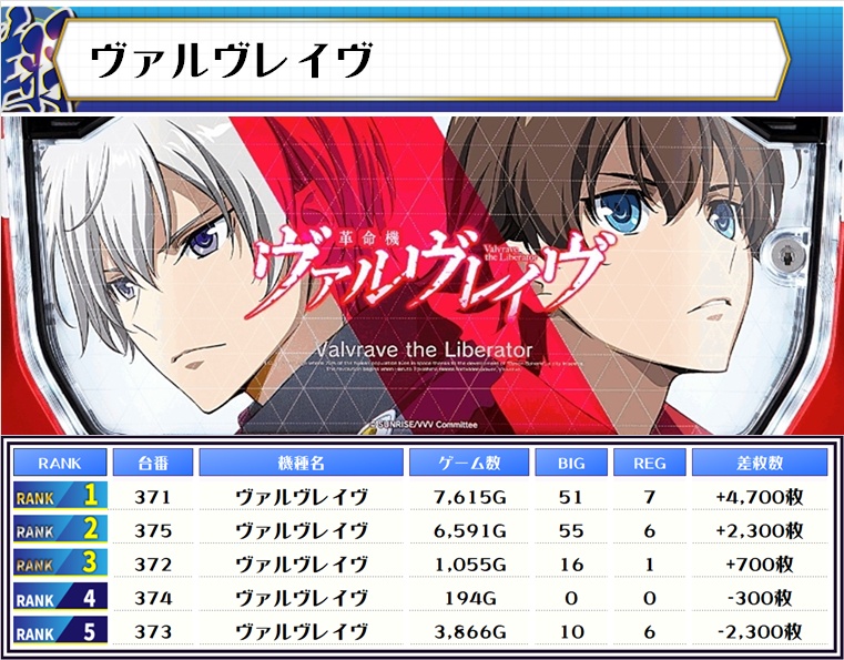 今回の調査では、【北斗の拳】【ヴァルヴレイヴ】といった人気AT機が好調でした☆